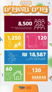 בזכות המערך הלוגיסטי של חב"ד, למעלה מ-8,500 גברים, נשים וילדים השתתפו בעשרות קריאות מגילה שנערכו בכ-120 מוקדים שונים ברחבי העיר. מלבד הצד הרוחני, פעילי חב"ד דאגו שהחסד יהדהד ברחובות עם חלוקתם של מעל 1,250 משלוחי מנות וסכום מרשים של 18,587 ש"ח שחולקו על ידם כ"מתנות לאביונים" למשפחות נזקקות ביום הפורים עצמו.